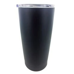20 oz. capacity black stainless steel travel mug with doubled wall vacuum insulation crystal clear top. 18/8 stainless steel. Size is 7 inch height.