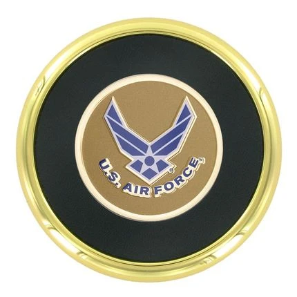 Gold plated metal coaster comes with 2 inch U.S.A. Air Force insert, bordered with black leather, black felt bottom.