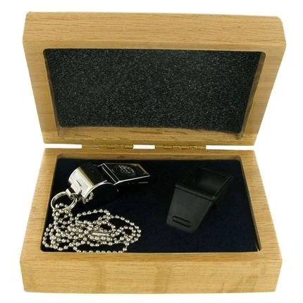Deluxe silver whistle gift set in a genuine oak box with velour and foam insert. Black rubber safety cover and 24 inch beaded gold chain included. Box can be laser engraved.