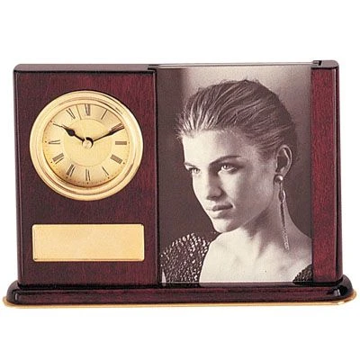 5 3/8″ x 7″ high gloss piano finish rosewood desk clock photo frame. Holds 3 1/2″ x 5″ photo.