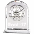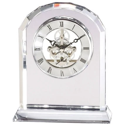 Optical crystal desk clock with arch beveled edge with see through quartz movement. Size 6-3/4 inch (height) x 5-1/2 inch (width) x 2 inch (thickness).