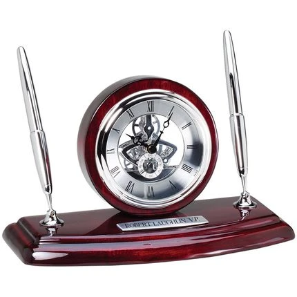 - Silver skeleton quartz desk clock with piano rosewood finish.