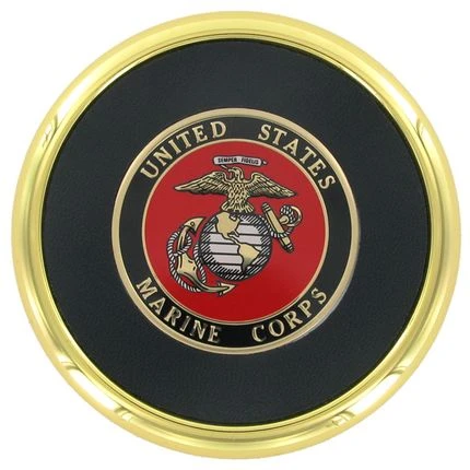 Gold plated metal coaster comes with 2 inch U.S.A. Marine Corps insert, bordered with black leather, black felt bottom.